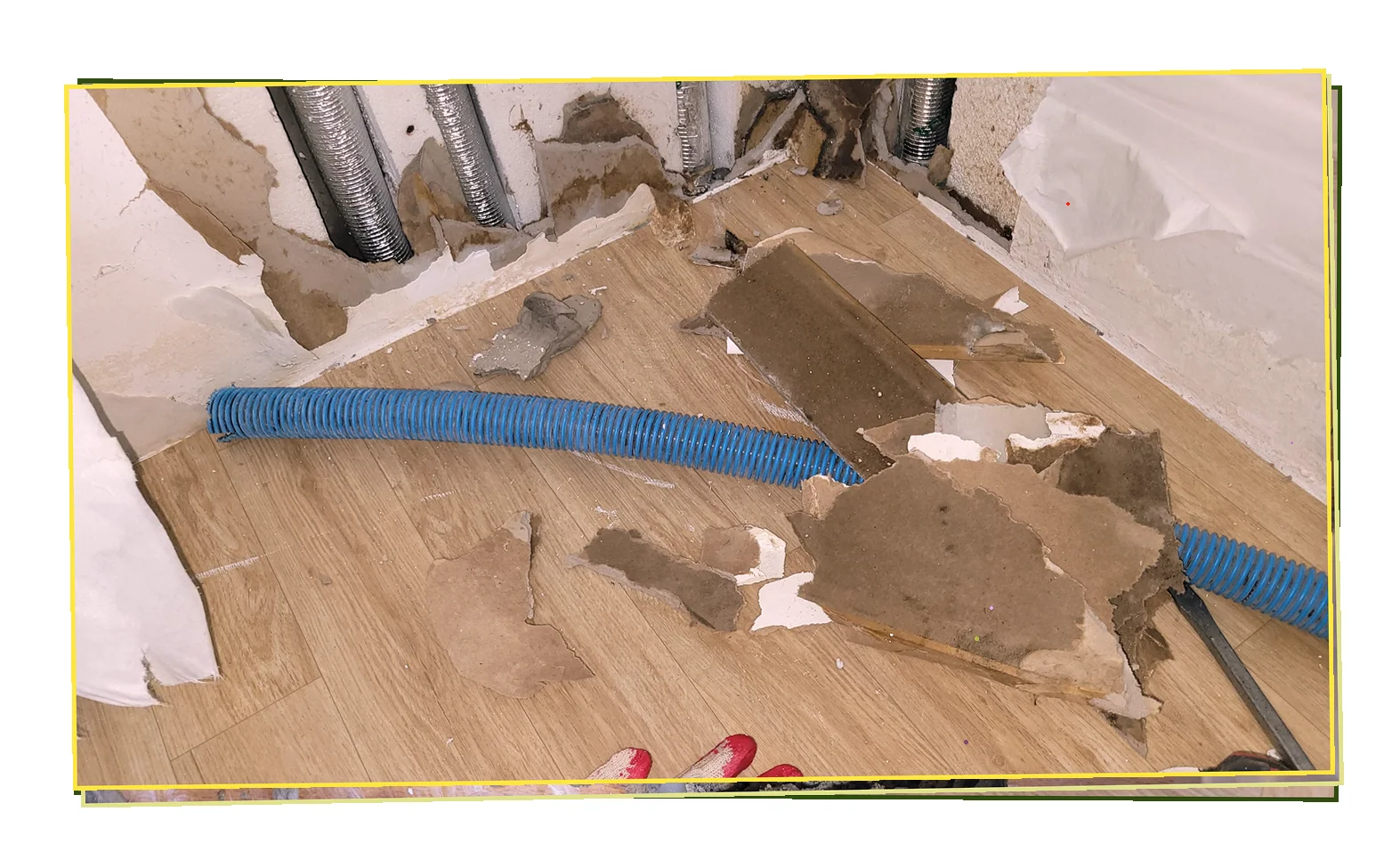 벽 안쪽과 천장 내부에서 훨씬 더 광범위한 손상이 진행 중이었습니다